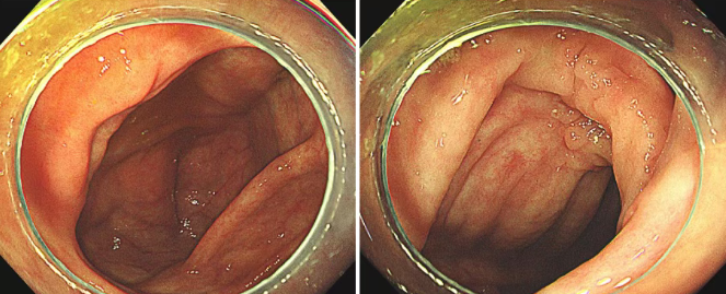 入院后,无痛电子肠镜进一步显示,回盲部至乙状结肠的粘膜大面积充血、水肿,散见片状红斑,粘膜网络不清,表面还覆盖少许胶冻样粘液,距肛门 60cm 处管腔略狭窄。