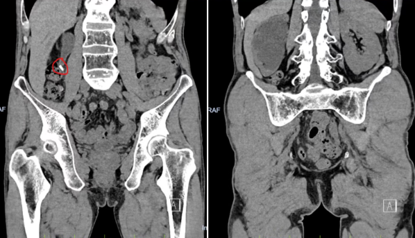 半年前,孙先生开始出现右侧腰背部疼痛,每次发作持续约半小时。由于没有尿频、尿急、尿痛等症状,他便自行在家服用排石药物。然而,病情并未好转。一个月前,孙先生来到长春国文医院就诊,经泌尿系CT检查发现,导致他长期疼痛的“元凶”竟是右侧输尿管上段的一颗结石。